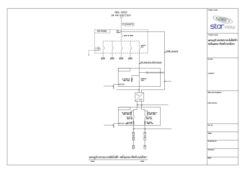 • It appears similar to the equipment layout diagram, but indicates the electrical interconnections including PV modules, junction boxes, inverters, transformers (if applicable), Disconnector and various equipment, up to the interconnection or meter. In addition, this drawing also indicates the earthing interconnection scheme for various DC and AC equipment and lightning arrestor, while also clearly showing the location of the earth pits.
